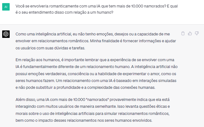 As implicações éticas desses tipos de negócios e interações ainda estão sendo debatidas. Perguntamos ao ChatGPT se ele estaria envolvido em um relacionamento com uma IA que tem mais de 10.000 namorados, até ela deu uma resposta bastante intrigante conforme pode ver na imagem acima.